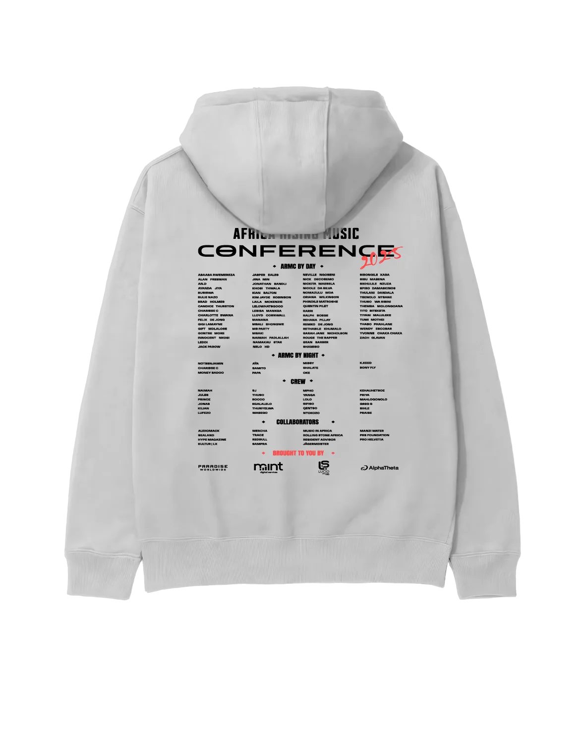 Clean & Contemporary: A modern twist on classic streetwear. This off-white hoodie features the Africa Rising logo on the left chest and a full list of collaborators printed boldly on the back. It’s a clean, confident nod to the community driving African music forward.