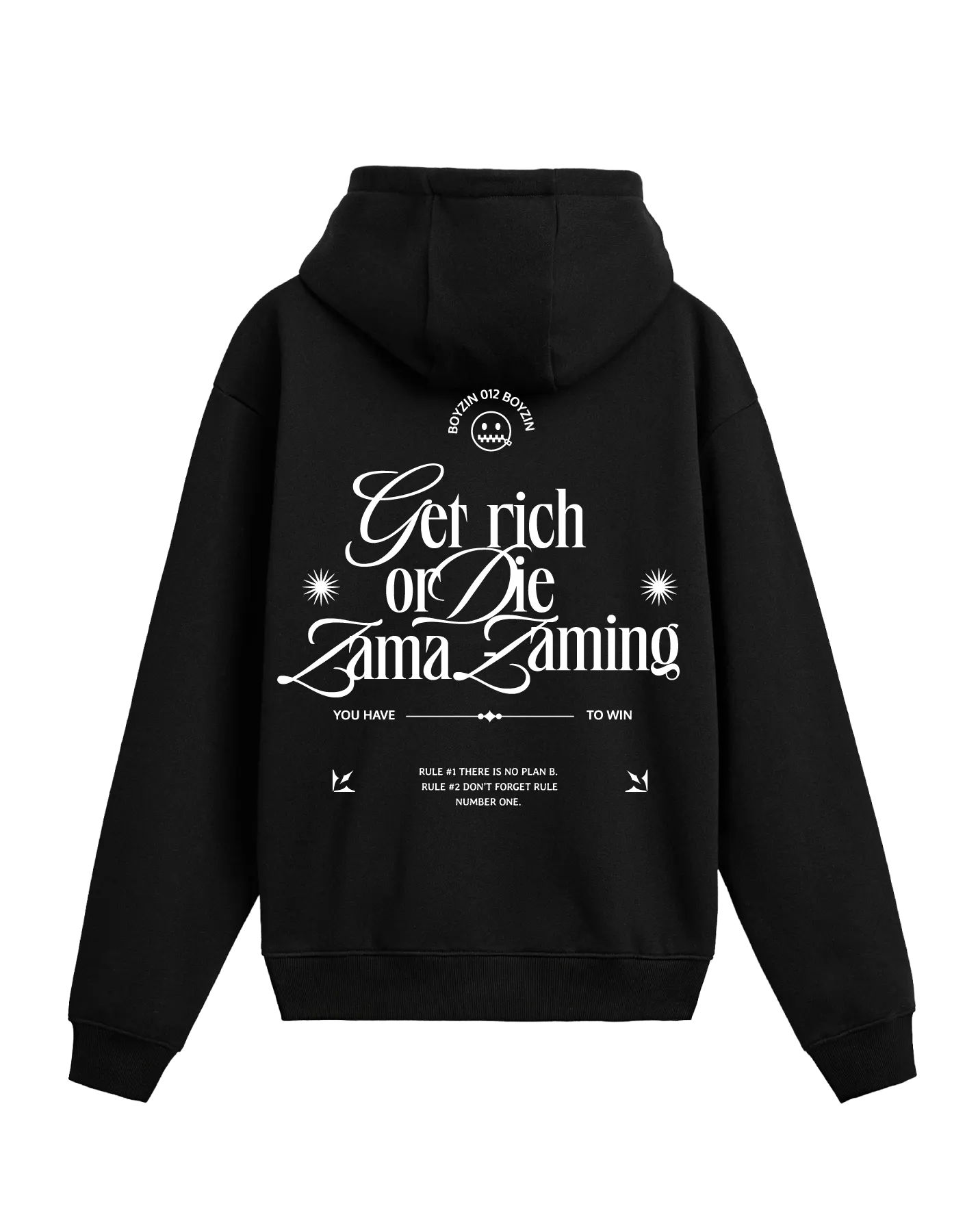 Available in black and white, the “Get Rich or Die Zama Zaming” (meaning “Get rich or die trying”) hoodie is crafted from a premium, heavyweight cotton blend that is soft, warm, and built to last. Its oversized fit ensures everyday comfort.