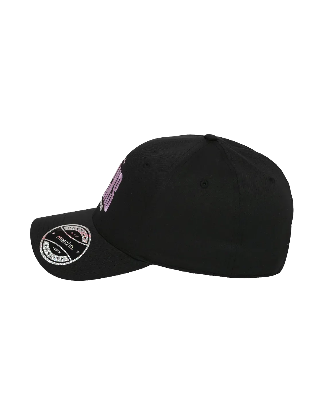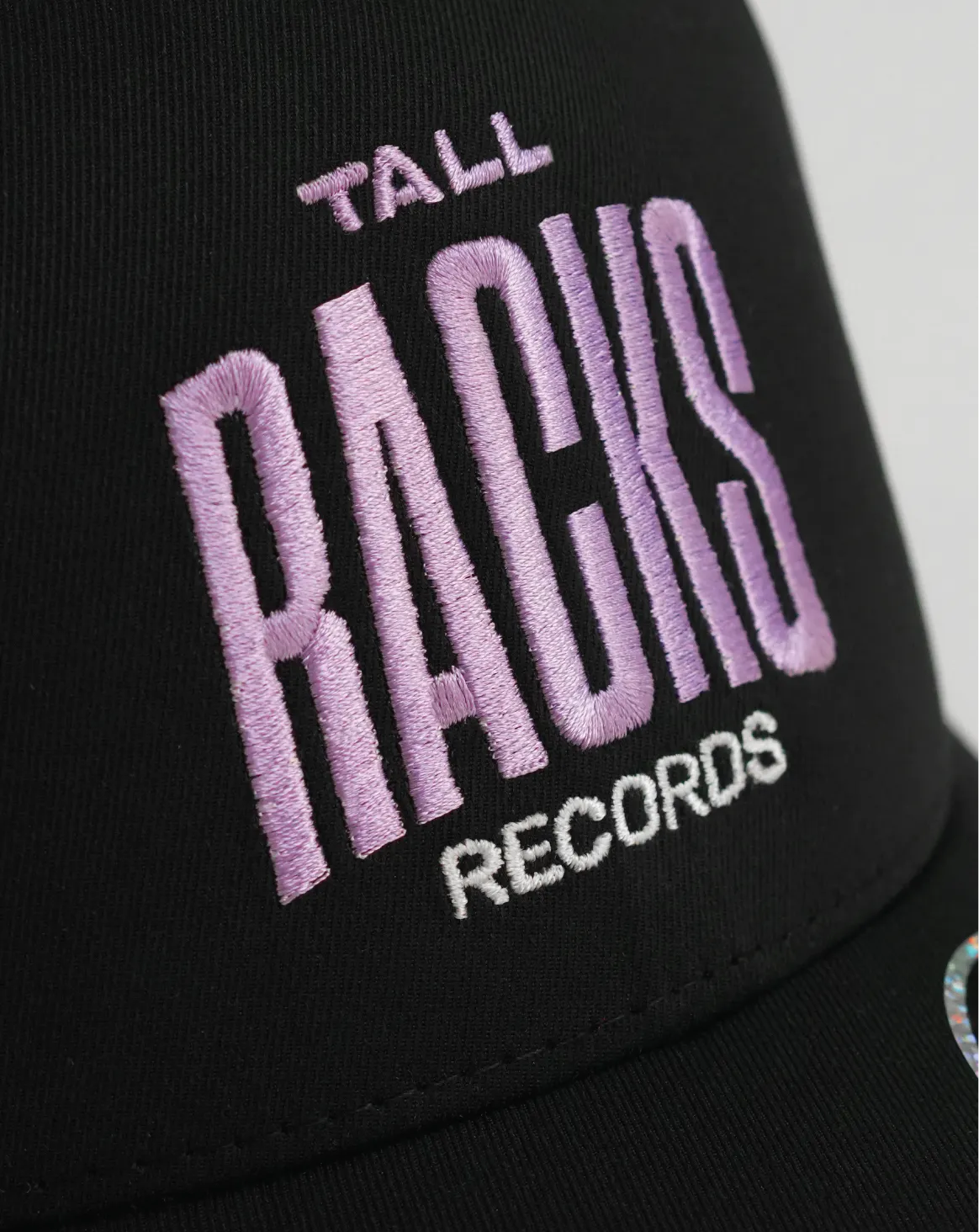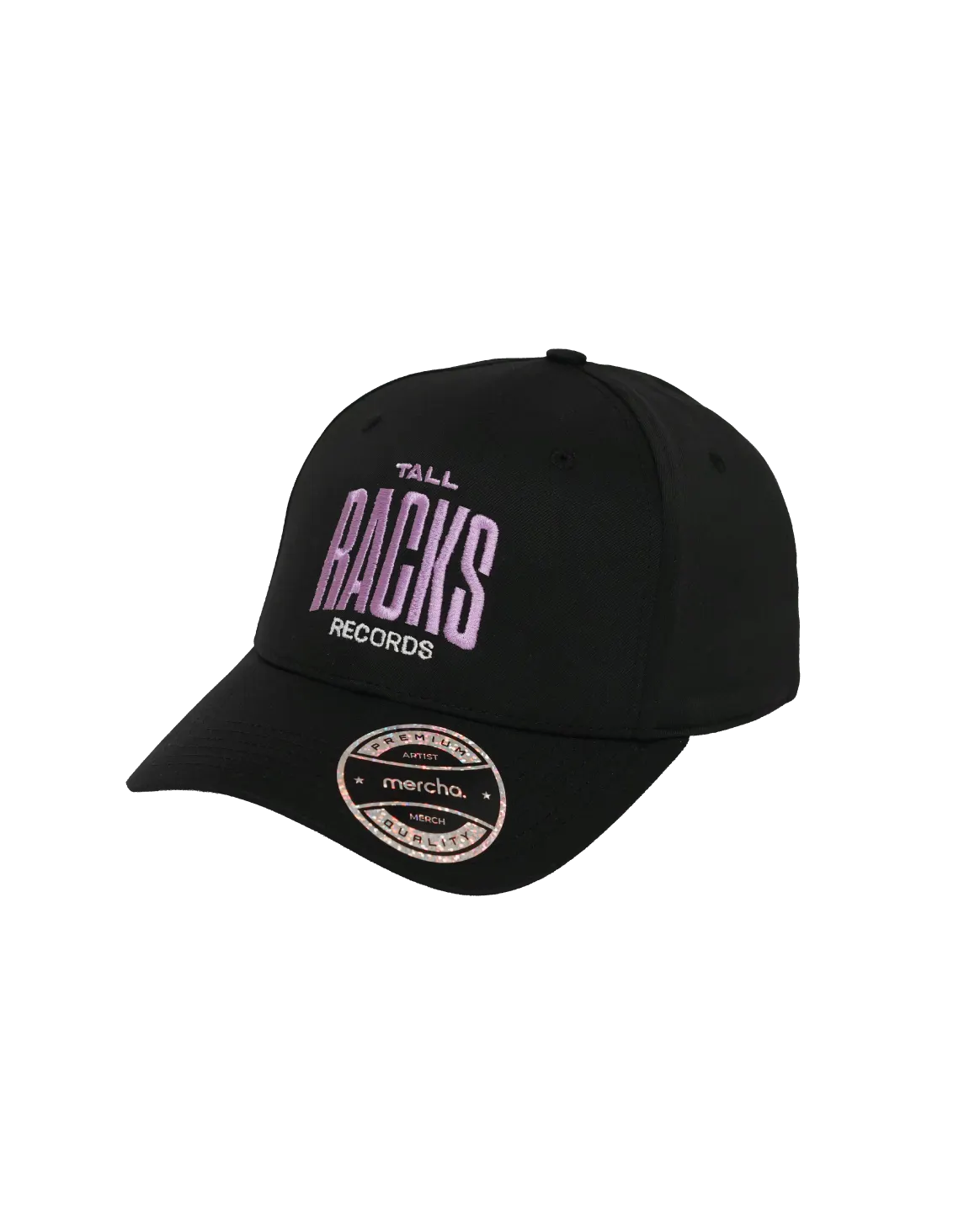 A classic embroidered, black curved-brim cap featuring raised Tall Racks embroidery in signature purple. Finished with a structured fit and adjustable closure, this cap completes the collection with a sharp, premium look that pairs effortlessly with any piece from the range.