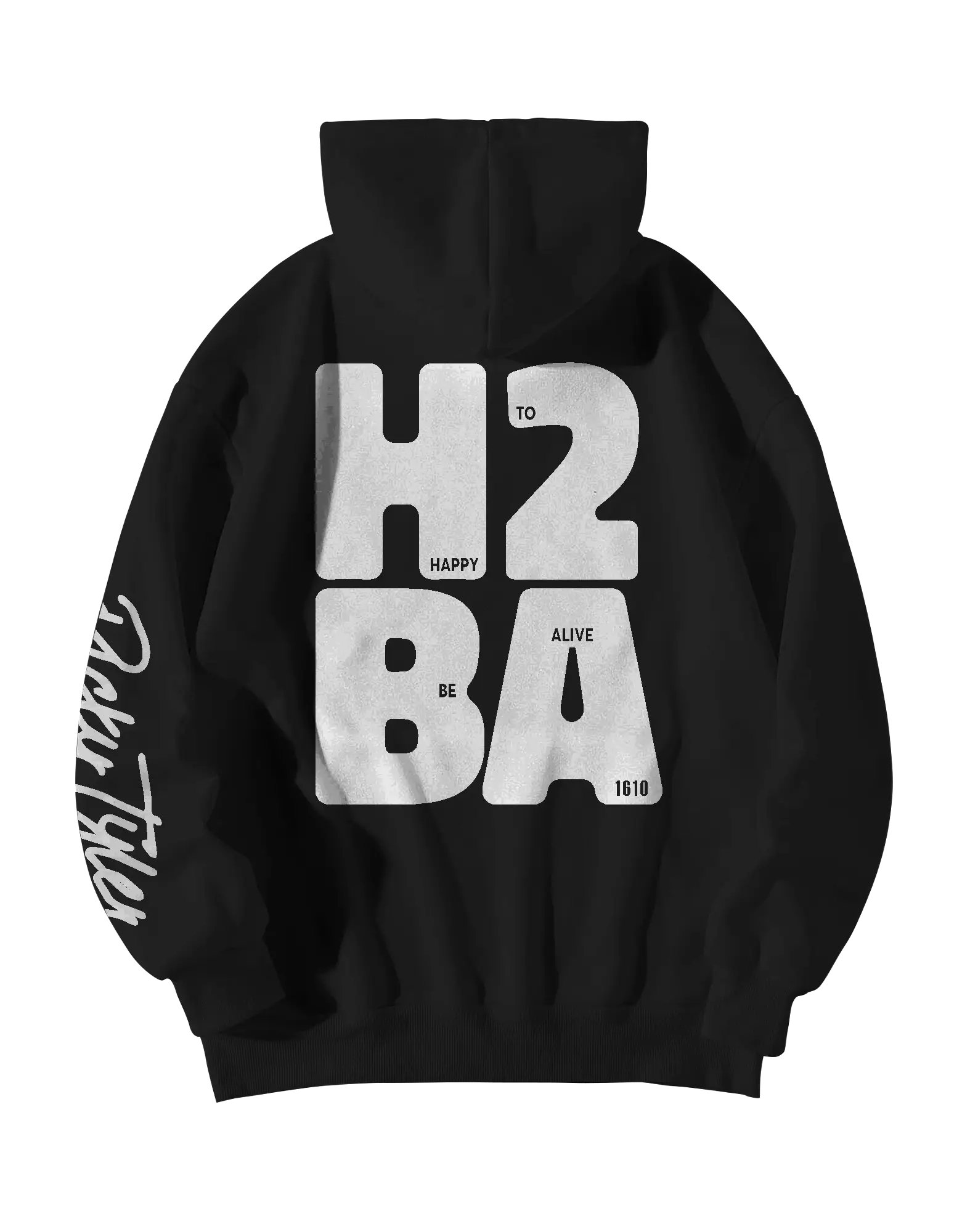Meet the H2BA Hoodie by Ricky Tyler. Crafted in luxurious 300 GSM fabric, this black hoodie features the “H2BA” album title on the front and a bold “Happy 2 Be Alive” graphic on the back. Ricky Tyler’s signature on the sleeve adds an exclusive touch, making it a must-have for fans.