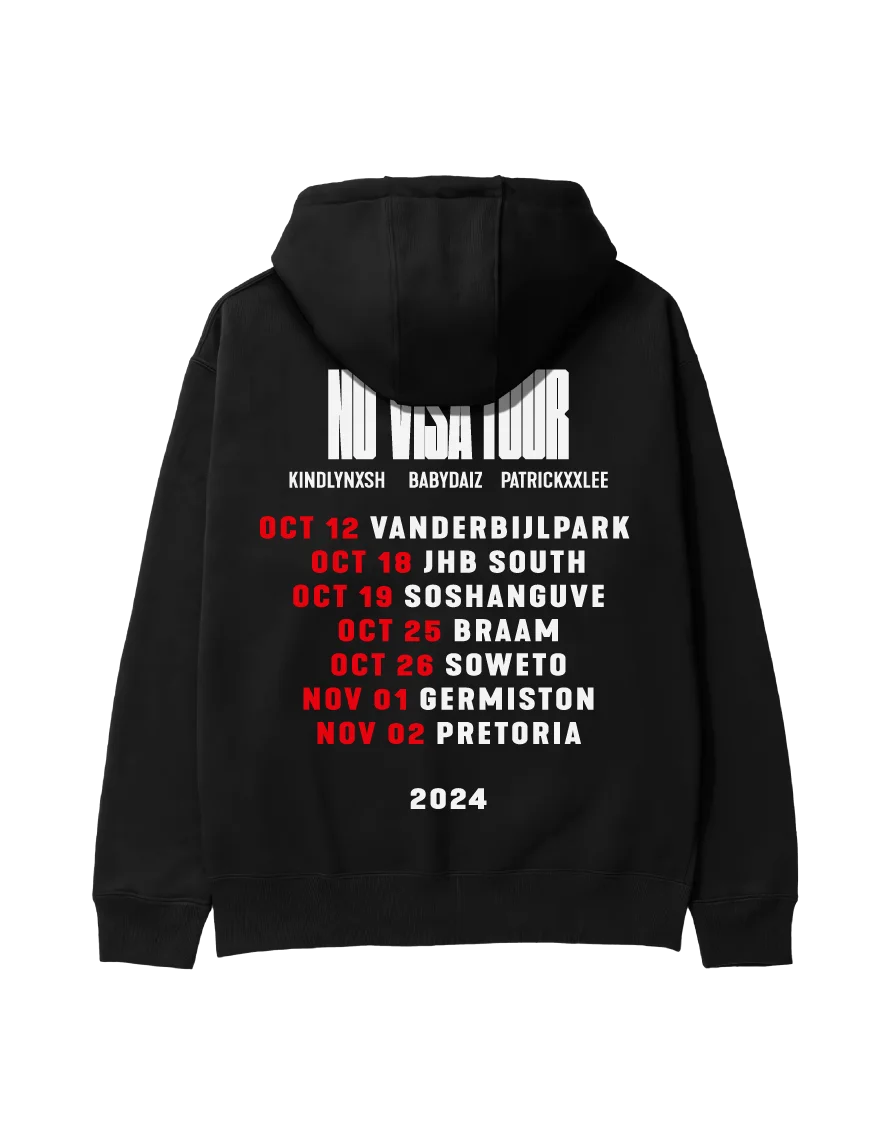 Stay cozy in style with the No Visa Hoodie in Black. The classic No Visa logo on the front and tour dates on the back make it a must-have for streetwear lovers and music fans alike.